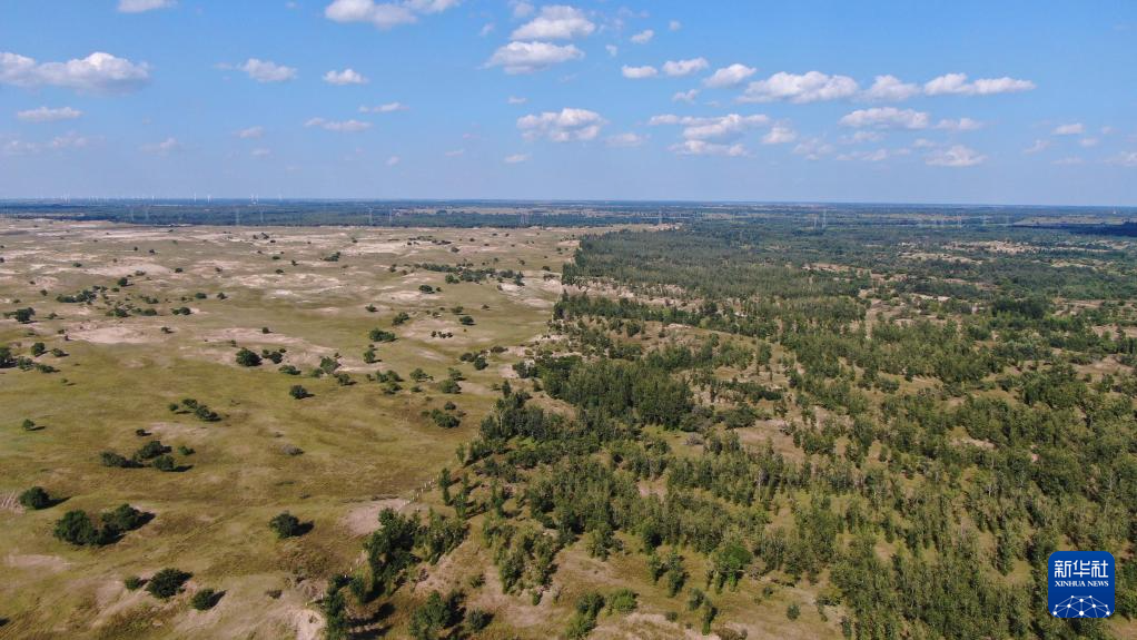 这是科尔沁沙漠南端和彰武县章古台固沙林场接壤处的航拍图(新华社记者 杨青 2021年8月30日摄)。