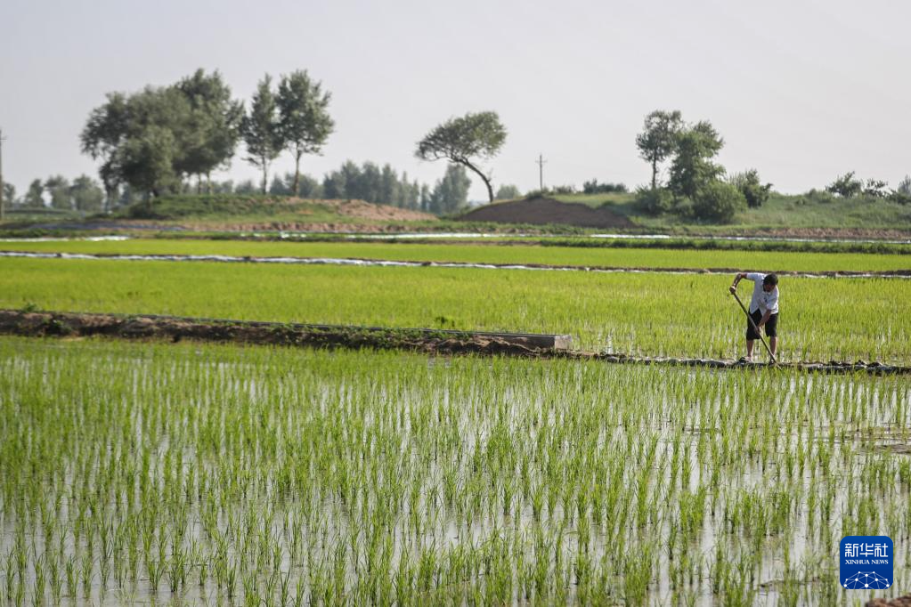 农户在阜新市彰武县大冷镇的水稻田里进行日常维护工作(新华社记者 潘昱龙 2023年6月14日摄)。