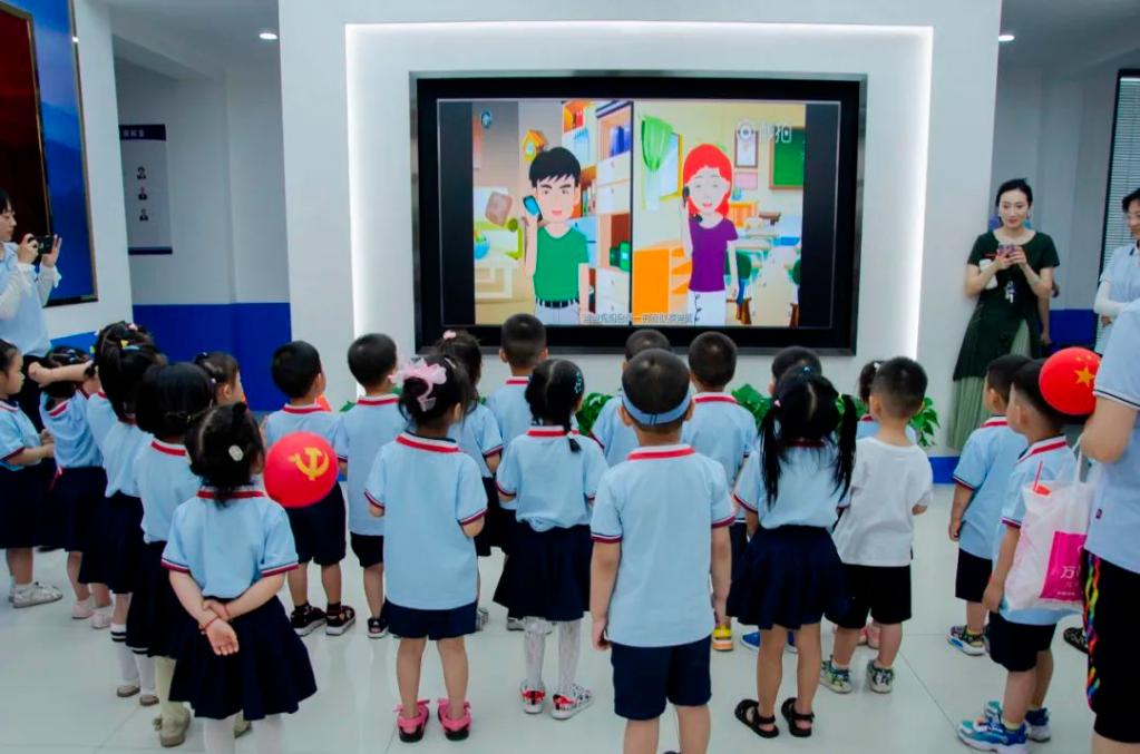 来到派出所的接待大厅,孩子们认真观看了1949年至2023年中国人民警察警服变迁史及儿童防拐识骗的动画片。