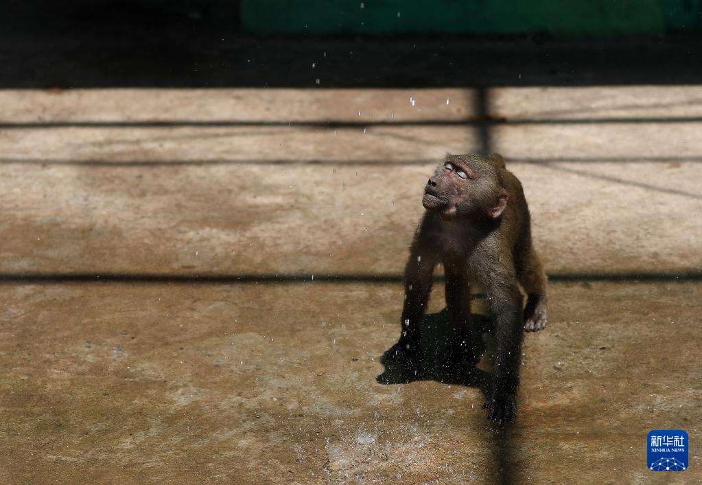 7月1日,鞍山市动物园的一只小猴享受喷水的惬意。新华社记者 姚剑锋 摄pagebreak