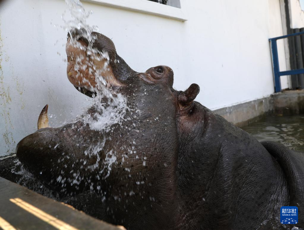 7月1日,河马“欢欢”在鞍山市动物园里冲水纳凉。新华社记者 姚剑锋 摄pagebreak