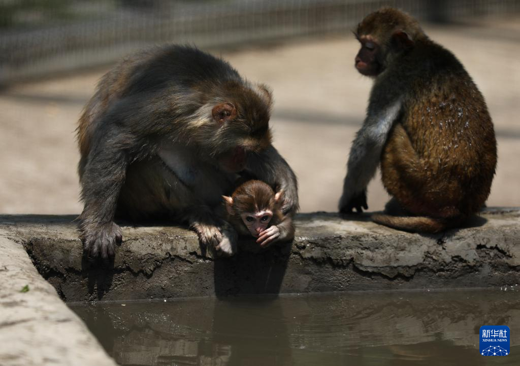 7月1日,几只小猴在鞍山市动物园猴山里的水池旁戏水纳凉。新华社记者 姚剑锋 摄pagebreak