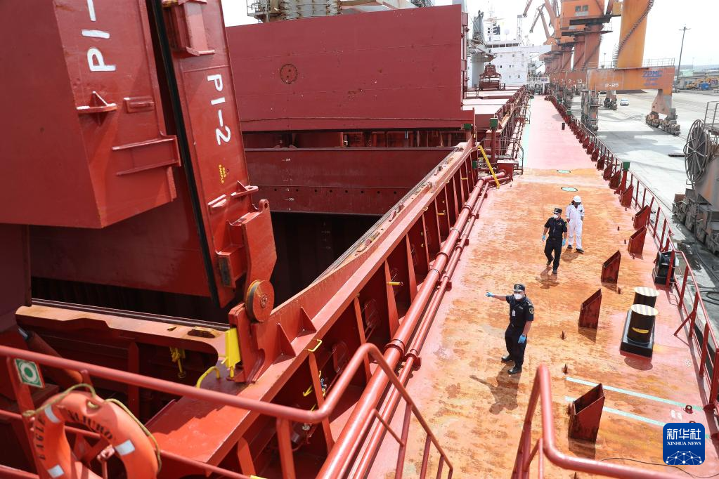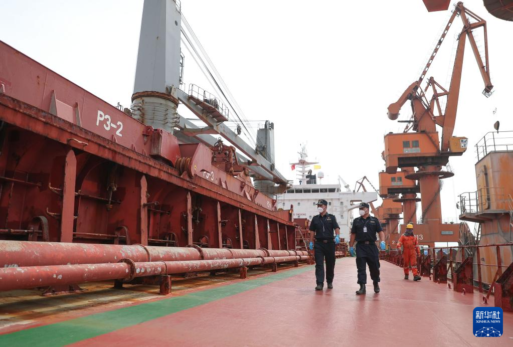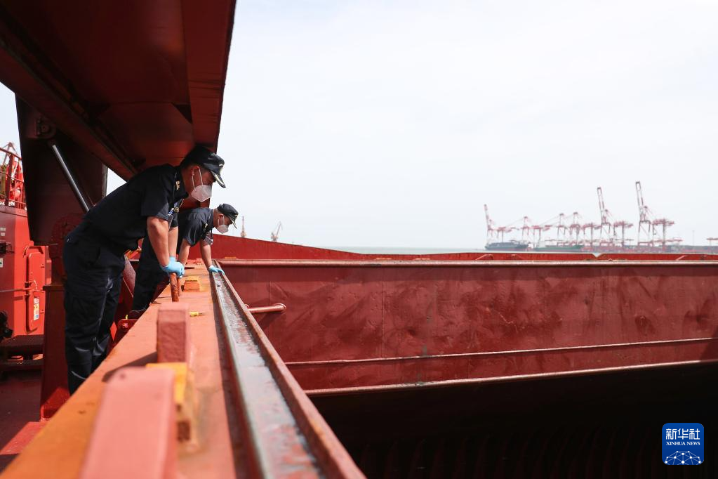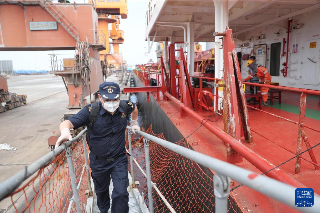 7月3日, 在锦州港码头,锦州海关关员张世奇(左)和张洪涛登上船只进行货物查验工作。新华社记者 龙雷 摄