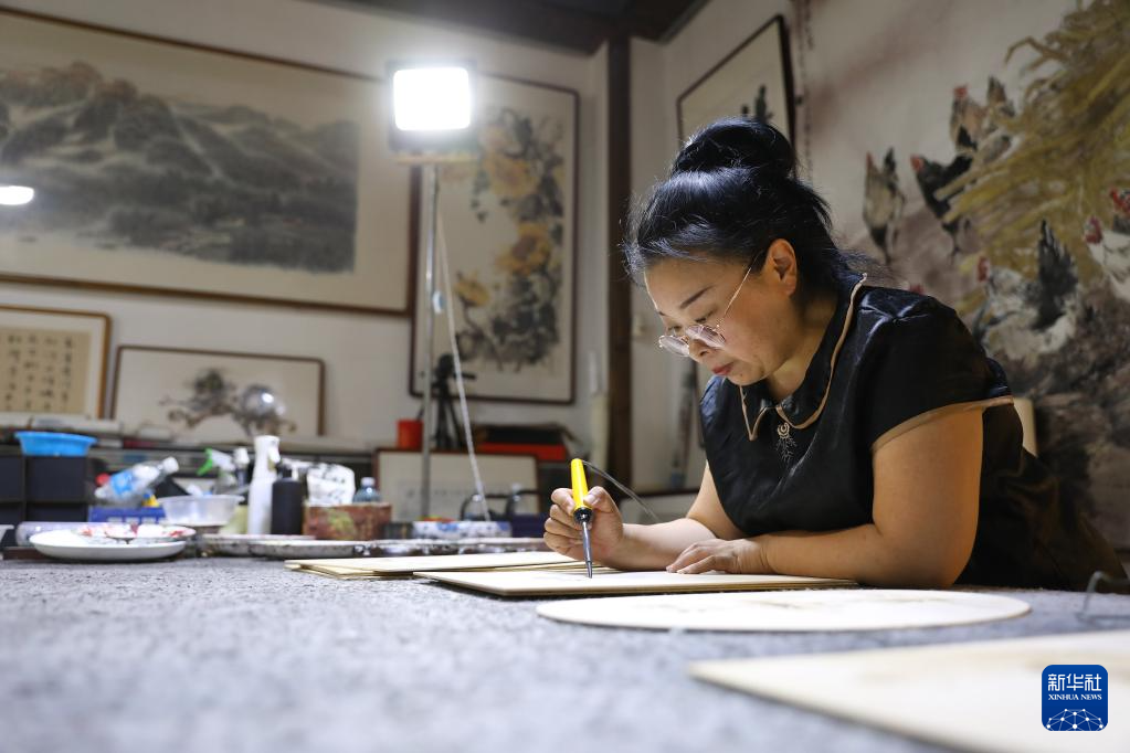 7月6日,李影在位于辽宁省营口市大石桥的工作室里进行木板烙画创作。新华社记者 姚剑锋 摄