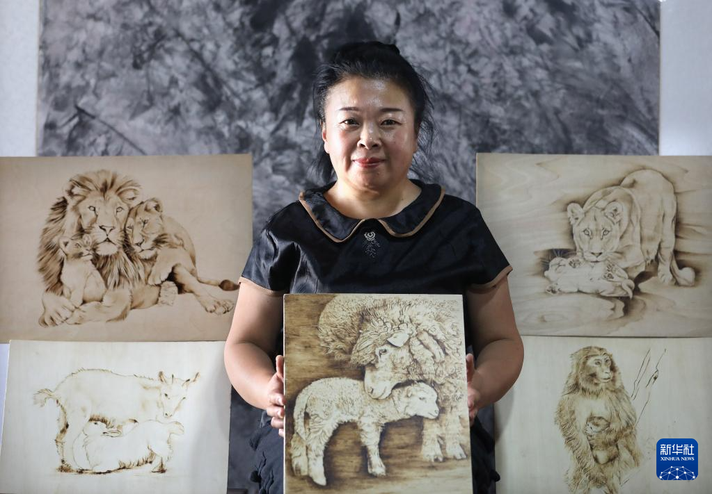 7月6日,李影在位于辽宁省营口市大石桥的工作室里展示她的系列木板烙画作品《动物的母爱》。新华社记者 姚剑锋 摄pagebreakpagebreak