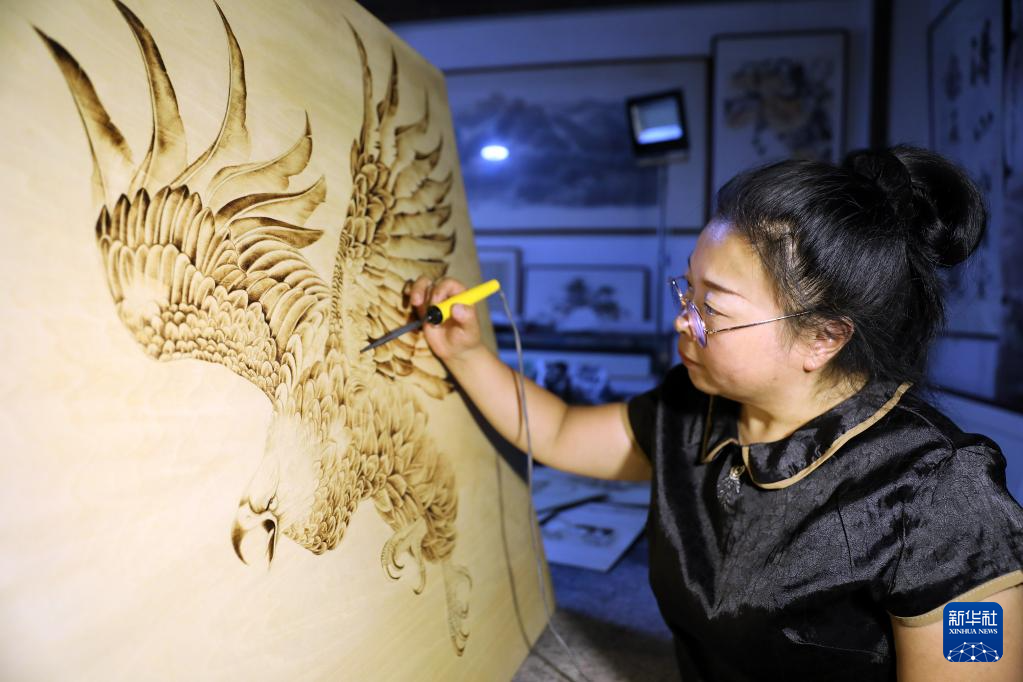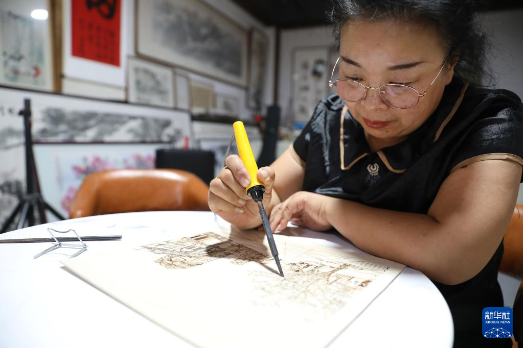 7月6日,李影在位于辽宁省营口市大石桥的工作室里进行木板烙画创作。新华社记者 姚剑锋 摄pagebreakpagebreak