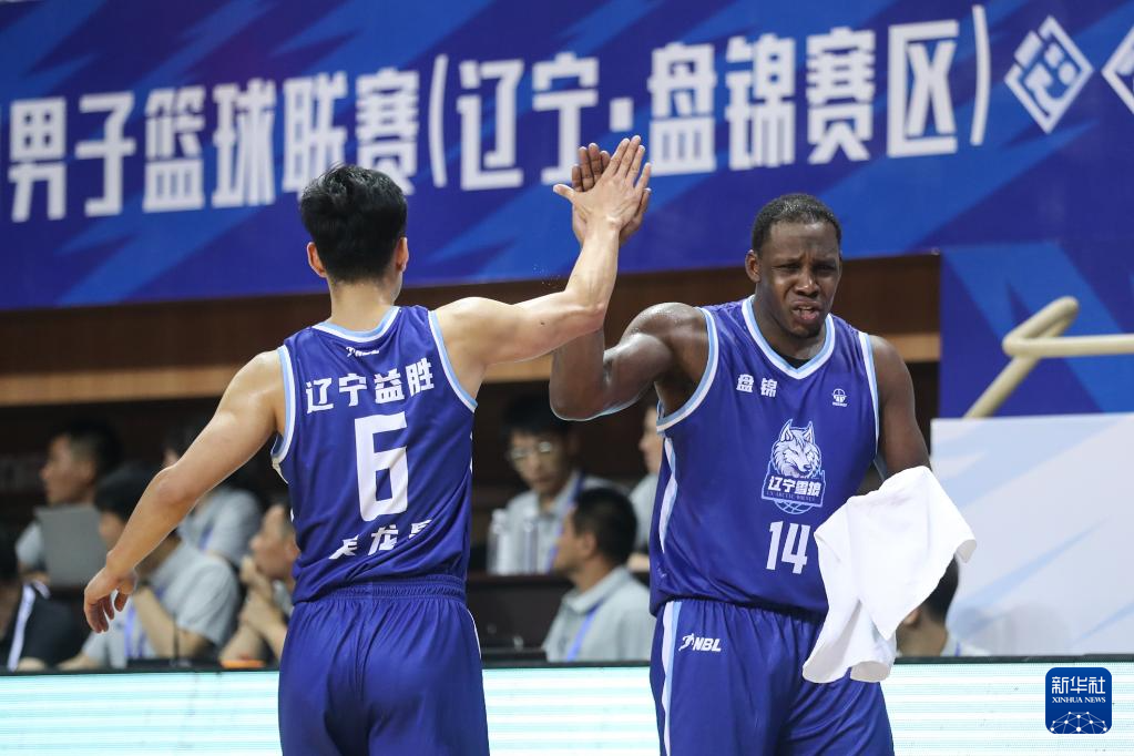 7月9日,辽宁益胜队球员哈德森(右)与队友吴龙昊击掌庆祝。新华社记者 潘昱龙 摄