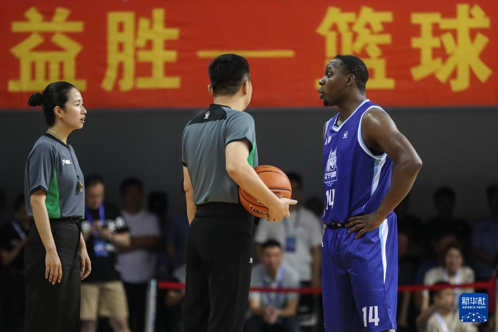 7月9日,辽宁益胜队球员哈德森(右)在比赛中对判罚表示不满。新华社记者 潘昱龙 摄