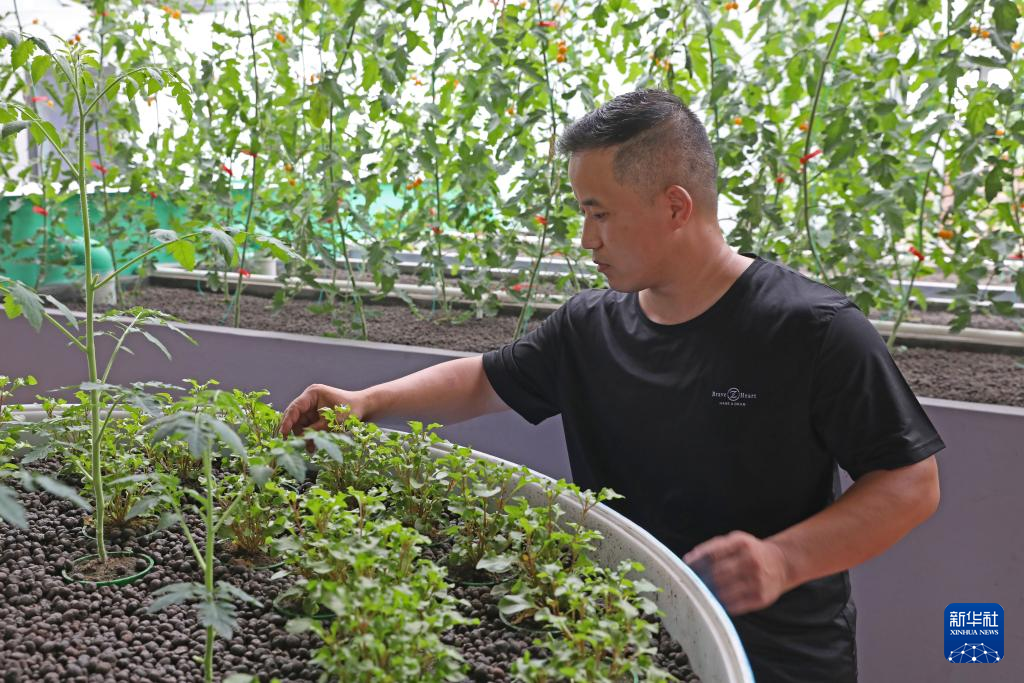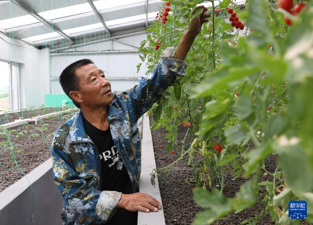 7月27日,工作人员在辽宁阜新韩家店镇下王村“虾菜共生”示范园内查看番茄长势。