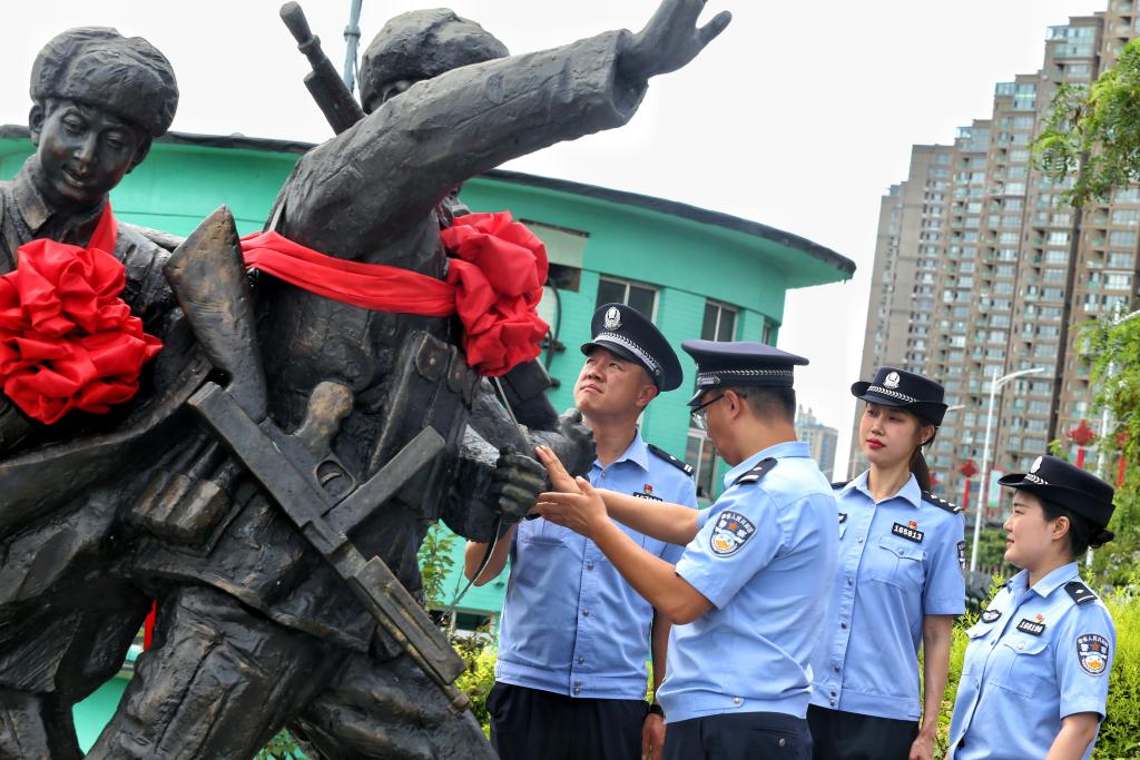 辽宁丹东边境管理支队振安边境管理大队与丹东港边检站民警瞻仰志愿军雕塑。(辽宁丹东边境管理支队供图)