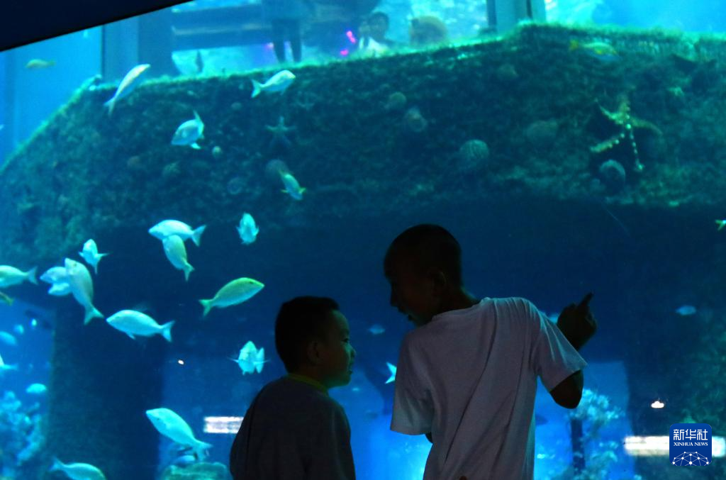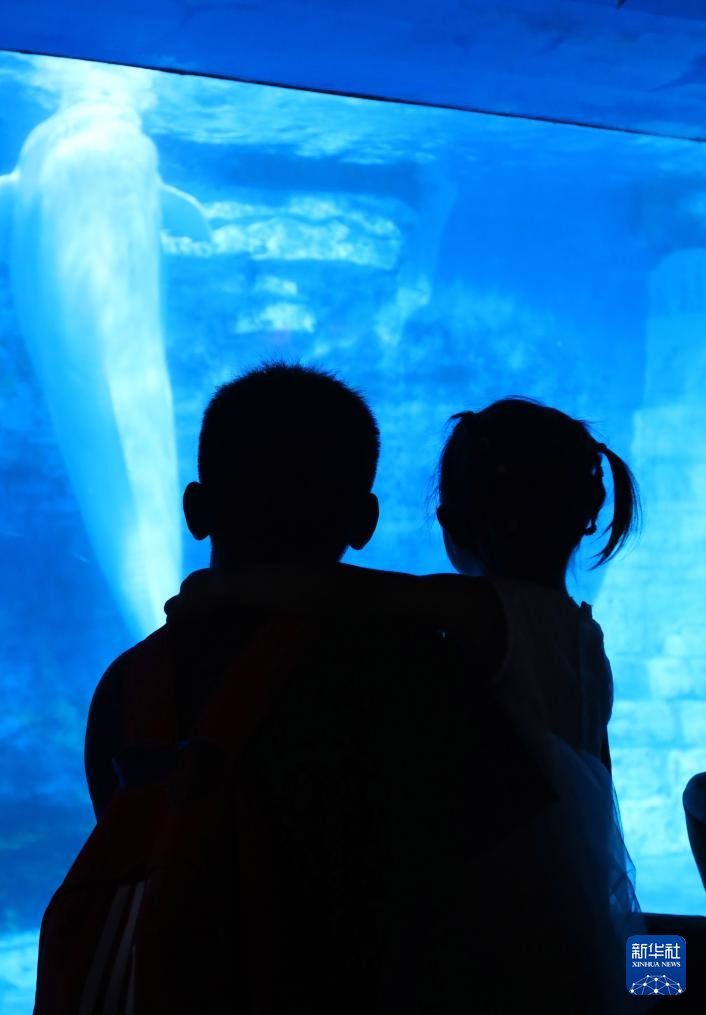 7月31日,儿童在大连老虎滩海洋公园极地馆内观赏海洋动物。新华社记者 陈为 摄