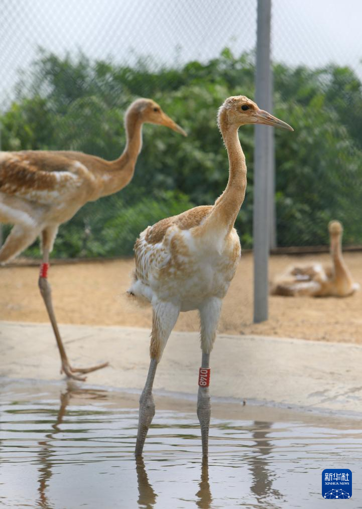 8月3日,丹顶鹤雏鸟在保护站内活动。新华社记者 陈为 摄pagebreak
