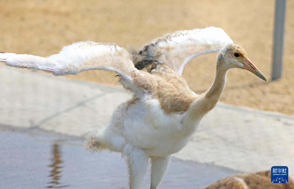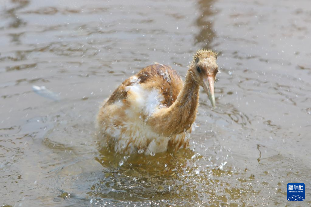 8月3日,丹顶鹤雏鸟在保护站内戏水。新华社记者 陈为 摄pagebreak