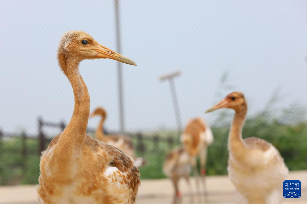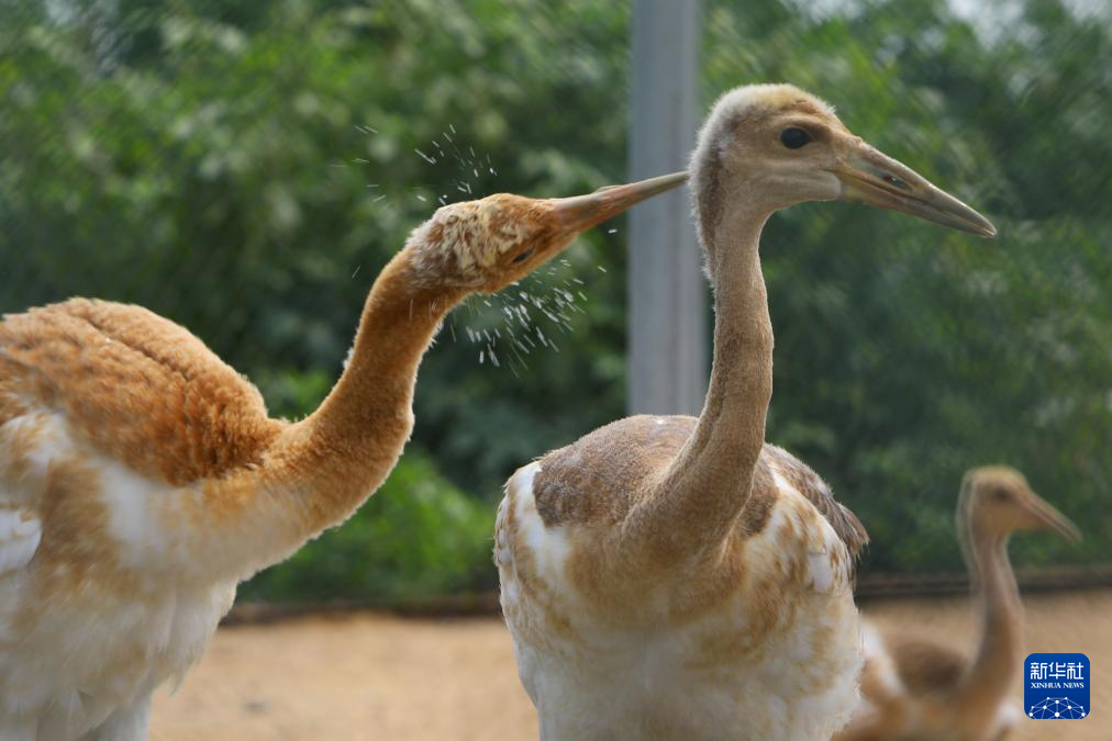 8月3日,丹顶鹤雏鸟在保护站内嬉戏。新华社记者 陈为 摄pagebreak