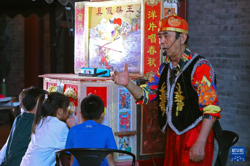 8月10日,小朋友在辽宁省沈阳市和平区老北市旅游休闲街区观看拉洋片。新华社记者 陈为 摄pagebreak