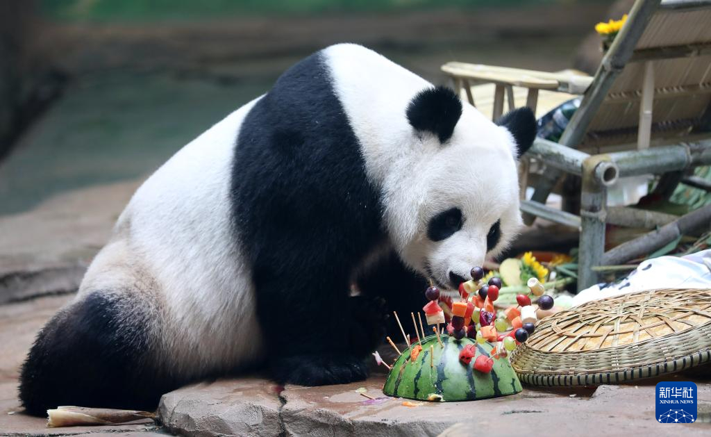8月11日,大熊猫“刚刚”在鞍山动物园熊猫馆里品尝工作人员准备的“水果串”。新华社记者 姚剑锋 摄pagebreak
