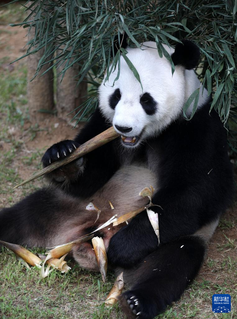 8月11日,大熊猫“刚刚”在鞍山动物园熊猫馆室外吃鲜竹笋。新华社记者 姚剑锋 摄