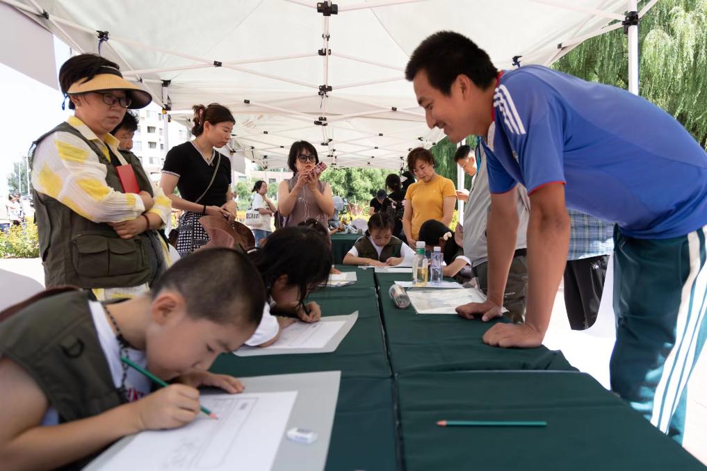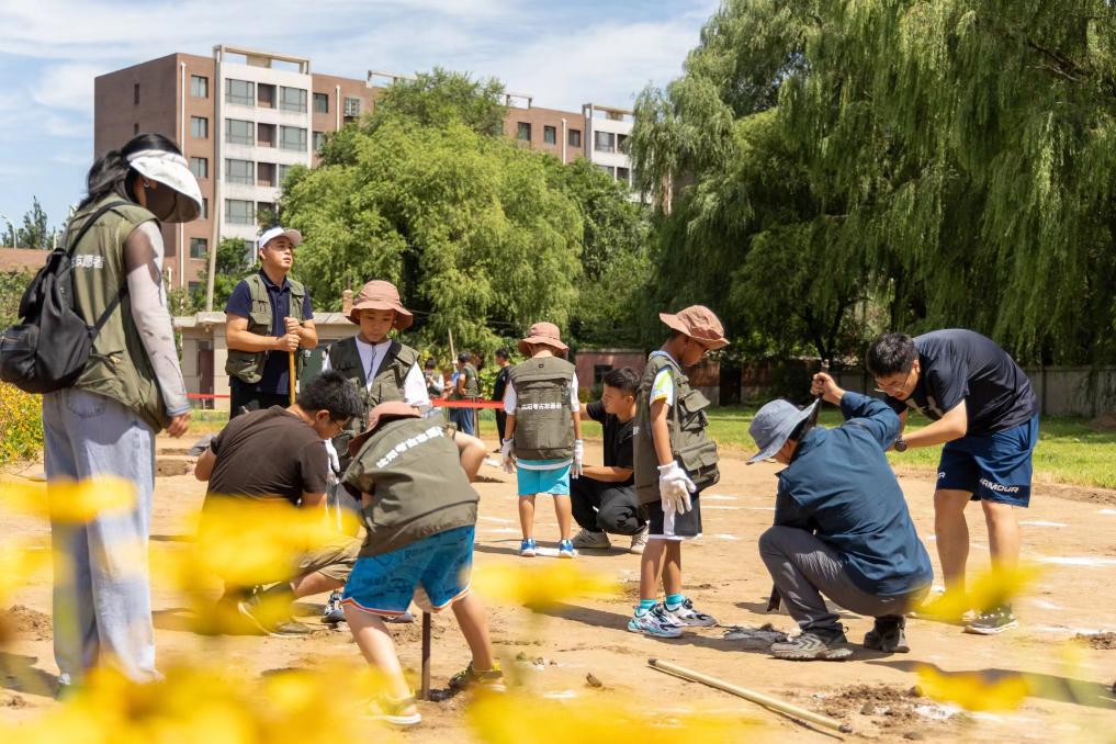 活动现场被划分为“考古勘探区”“考古发掘区”“考古绘图区”和“文物拓印区”。记者看到,作为公众考古活动的第一批参与者,几十名小学生蹲在“考古发掘”区,在志愿者和工作人员帮助下,小心翼翼拨开土层,探寻泥土里的“文物”。金丹和其他同伴则身着深绿色马甲,协助考古研究所工作人员开展现场教学。