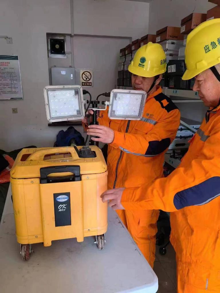 在凤城市蓝旗镇广胜村小学临时安置点,蓝旗镇供电所工作人员正在调试应急照明设备。(国网丹东供电公司供图)