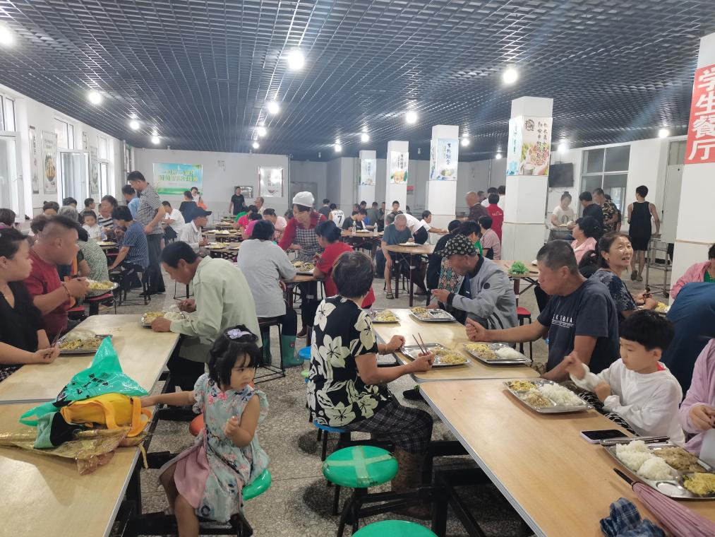 在岫岩满族自治县岭沟乡的集中安置点,被转移的村民在就餐。(岭沟乡供图)