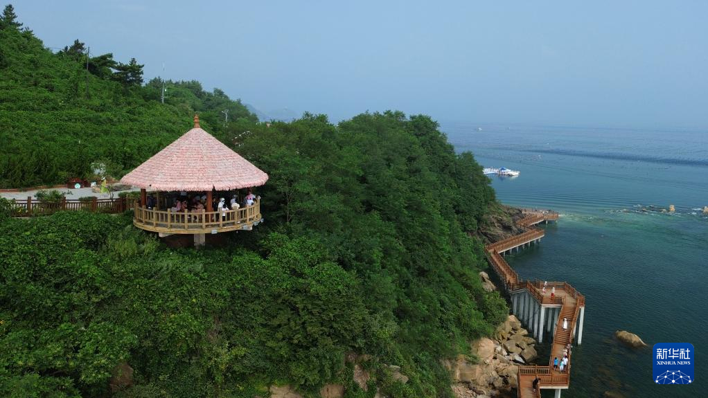 8月16日,游客在小长山岛小水口森林公园的观景亭游览(无人机照片)。新华社记者 陈为 摄