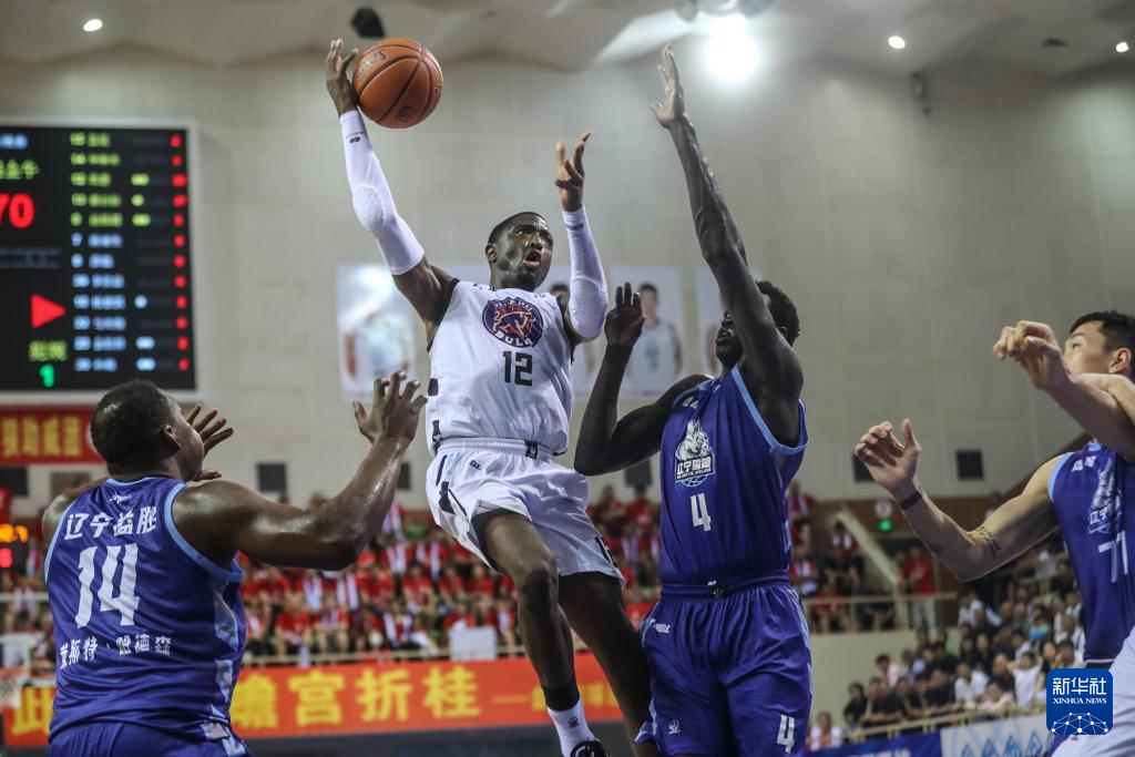 8月16日,辽宁益胜队球员哈德森(右)在比赛中投篮。新华社记者 潘昱龙 摄