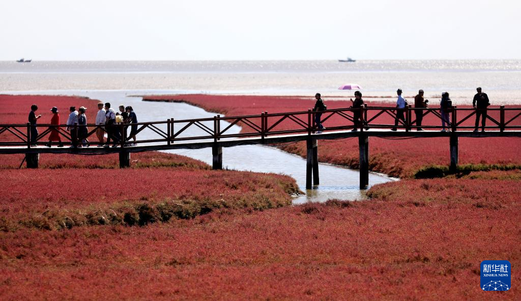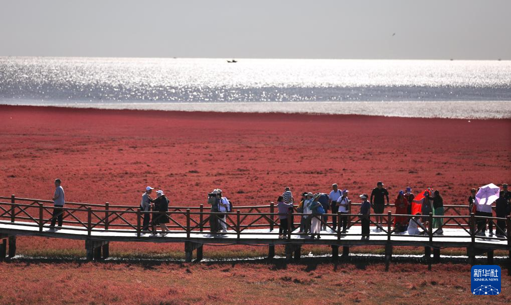 9月12日,游客在盘锦红海滩国家风景廊道景区游览。新华社记者 姚剑锋 摄