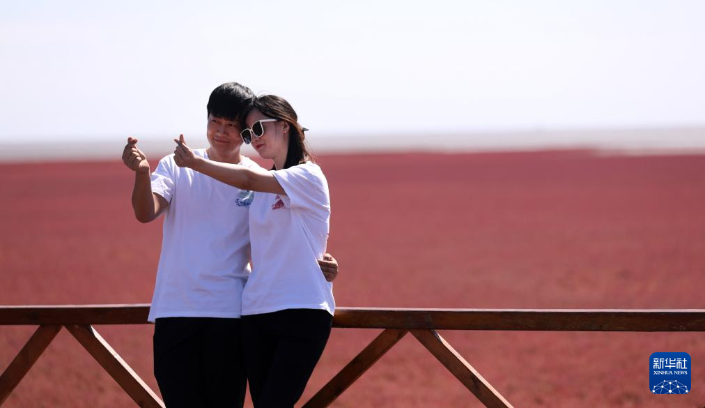9月12日,游客在盘锦红海滩国家风景廊道景区留影。新华社记者 姚剑锋 摄pagebreak