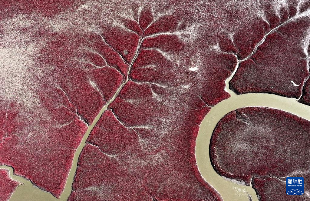 盘锦红海滩国家风景廊道景区内的红海滩(9月12日摄,无人机照片)。新华社记者 姚剑锋 摄pagebreak