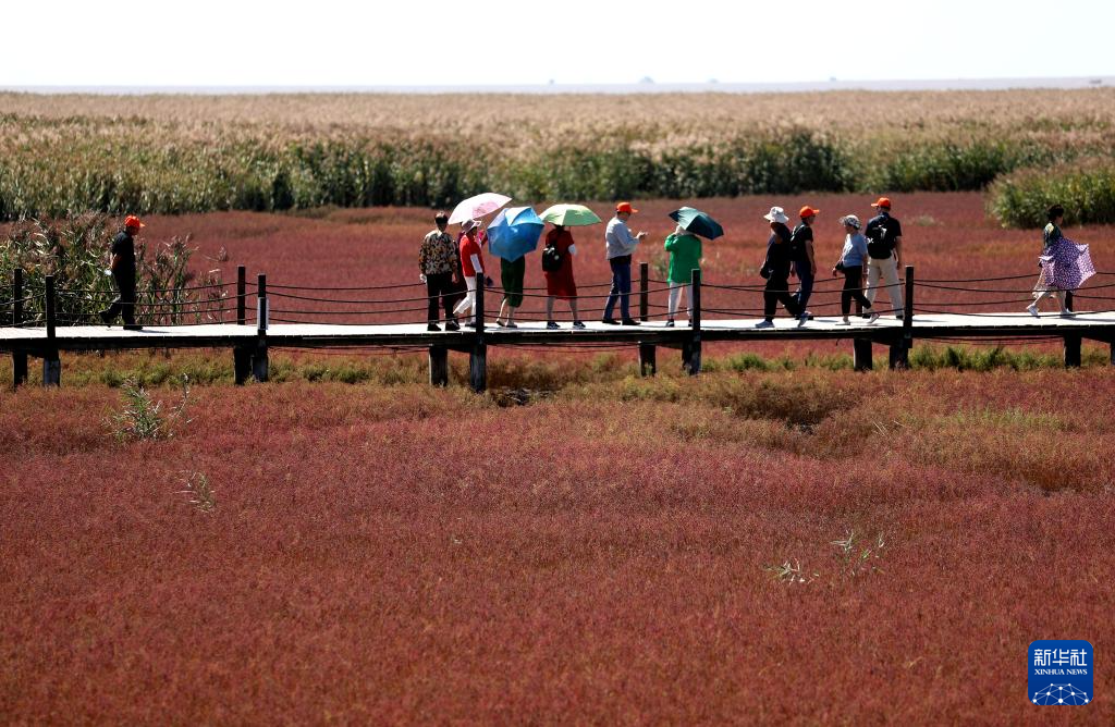 9月12日,游客在盘锦红海滩国家风景廊道景区游览。新华社记者 姚剑锋 摄pagebreak