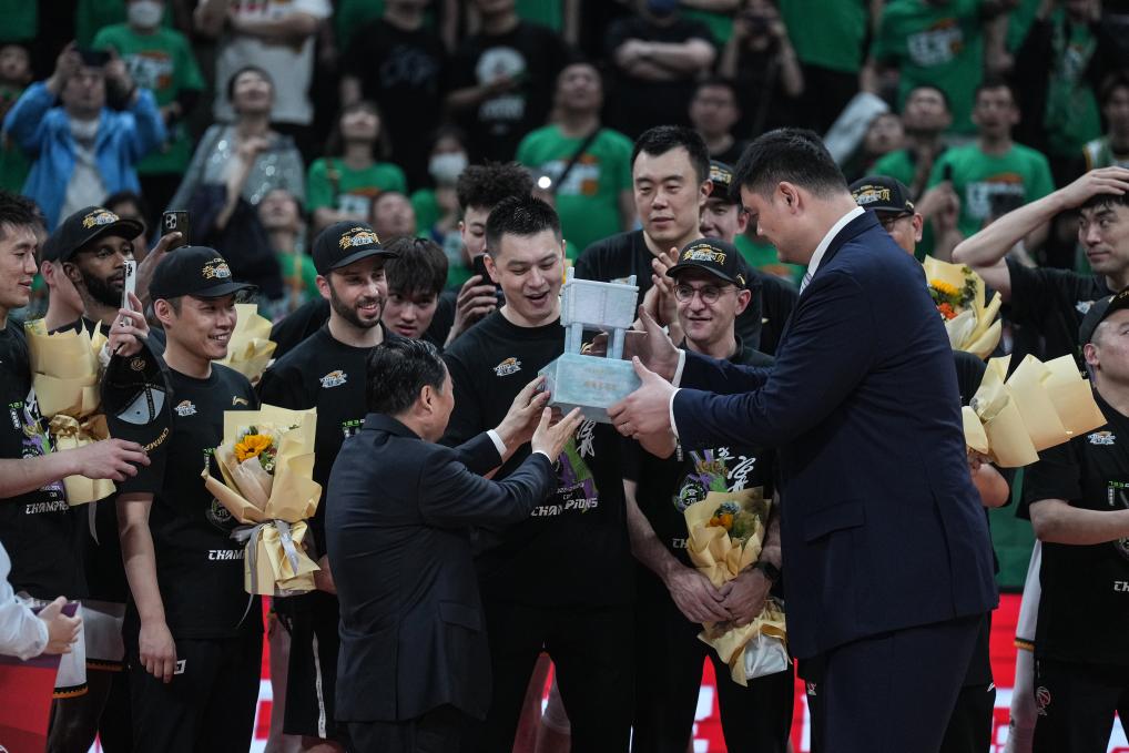 5月15日,时任辽宁本钢队主教练杨鸣在颁奖仪式上接过总冠军奖杯。新华社记者 潘昱龙 摄