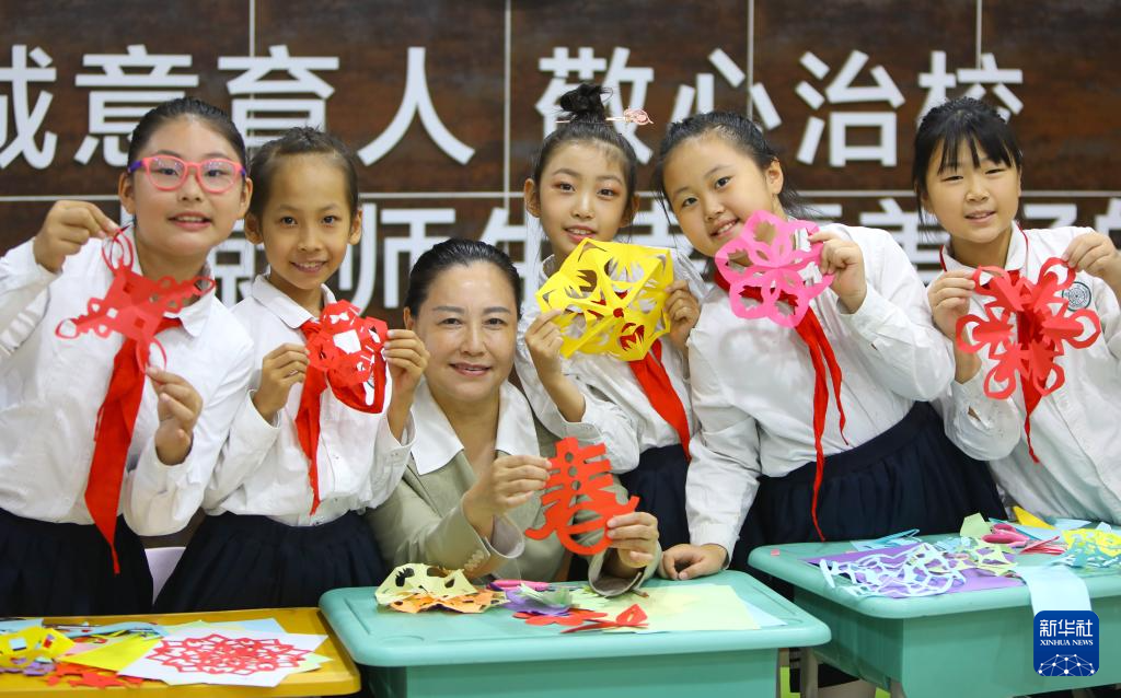 9月22日,孩子们和老师展示丰收节的主题剪纸作品。新华社记者 陈为 摄