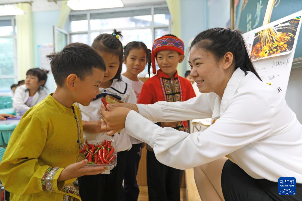 9月22日,老师带领孩子们“感受丰收的味道”。新华社记者 陈为 摄