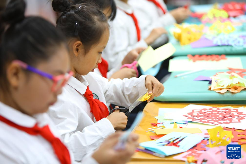9月22日,孩子们在老师的带领下创作丰收节的主题剪纸作品。新华社记者 陈为 摄pagebreak