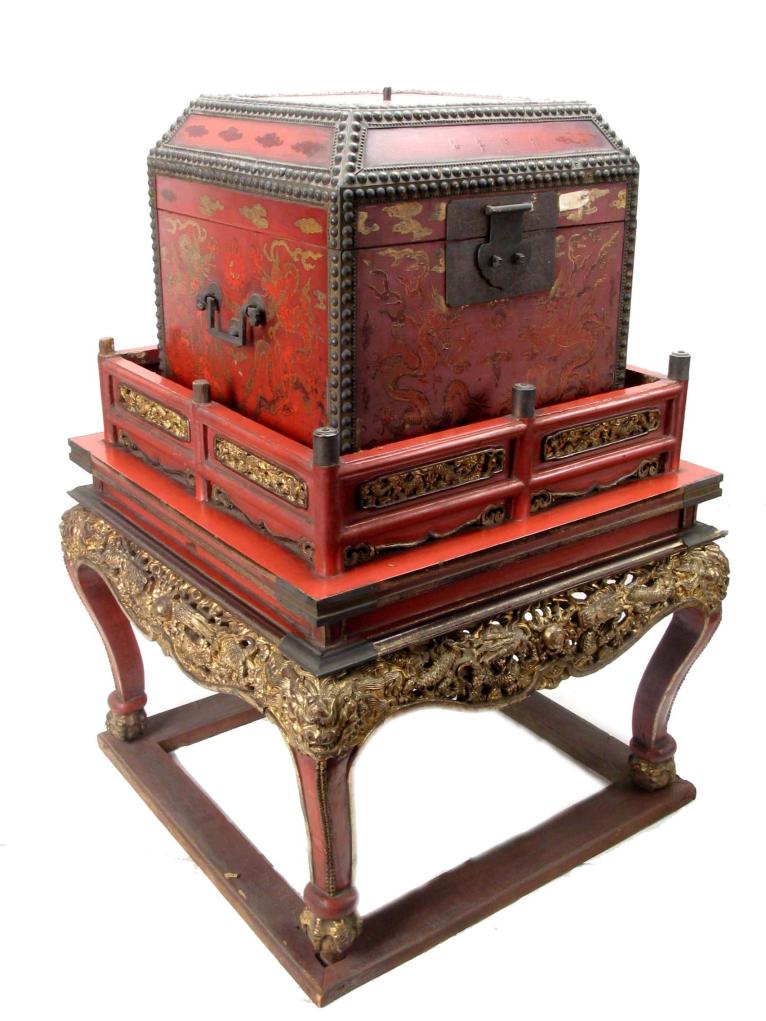 此次展出的“清朱漆描金雕云龙国宝盒”,就是这类装具的代表之一。这套国宝盒为盛装清初皇帝玉玺的套盒,专门用于盛装皇太极至康熙时期的十方玉玺。乾隆十一年(公元1746年),清高宗弘历传旨将清初皇帝玉玺“盛京十宝”恭贮盛京皇宫,尊藏于凤凰楼之中,并特别制作盛放玉玺的装具——国宝盒。