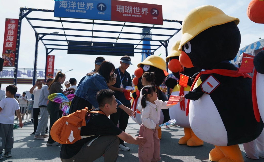 在鲸鱼广场,身穿企鹅玩偶服的工作人员和游客亲切互动,一会儿跳起巡游舞蹈,一会儿与排队的游客们一起对唐诗,答对的游客都可以免费领取国庆礼物。另外,国潮乐队在鲸鱼广场进行民乐演出,身着传统汉服的“嫦娥”进行隔空弹琴,让圣亚海洋世界充满了传统佳节的温情。