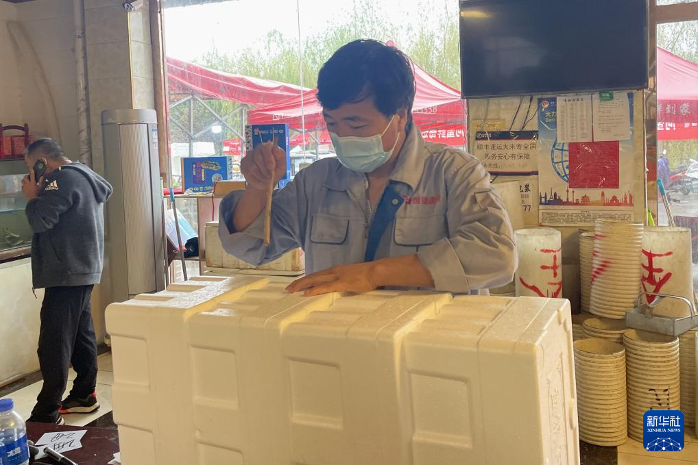 在胡家河蟹市场,商户在为打包好的河蟹盒扎孔。新华社记者武江民 摄
