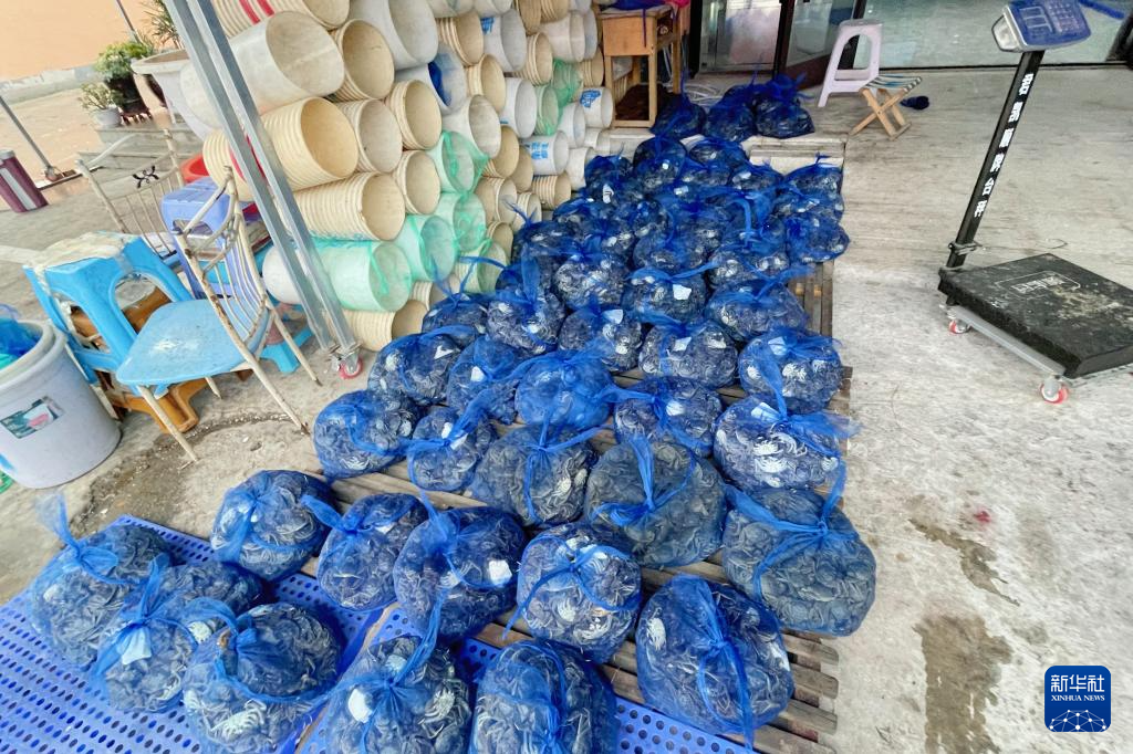 在胡家河蟹市场,商户门前堆放着装满河蟹的网兜。新华社记者武江民 摄