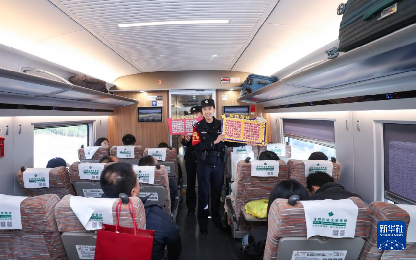 当日,沈阳铁路公安局沈阳公安处乘警支队女子乘务大队民警走进高铁车厢向乘客进行反诈骗宣传和安全乘车宣传,增强乘客保护人身和财产安全的意识。pagebreak