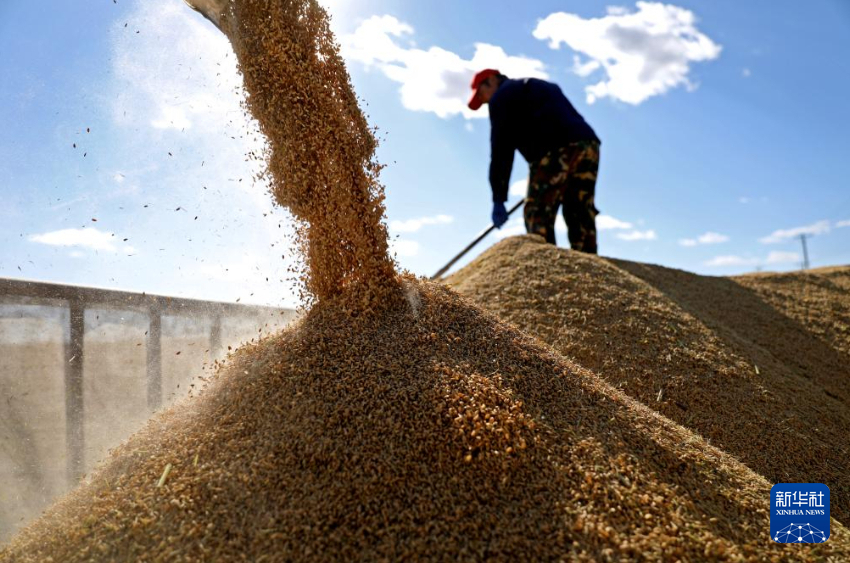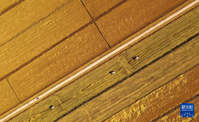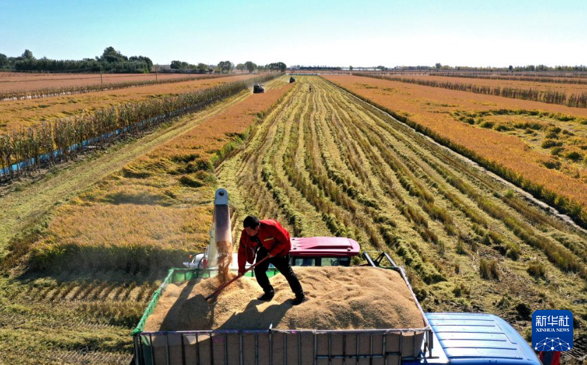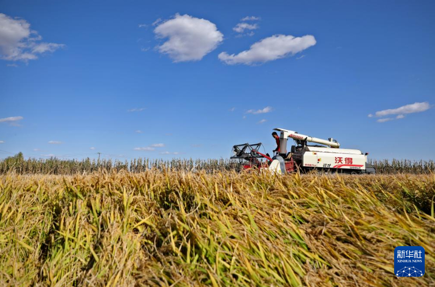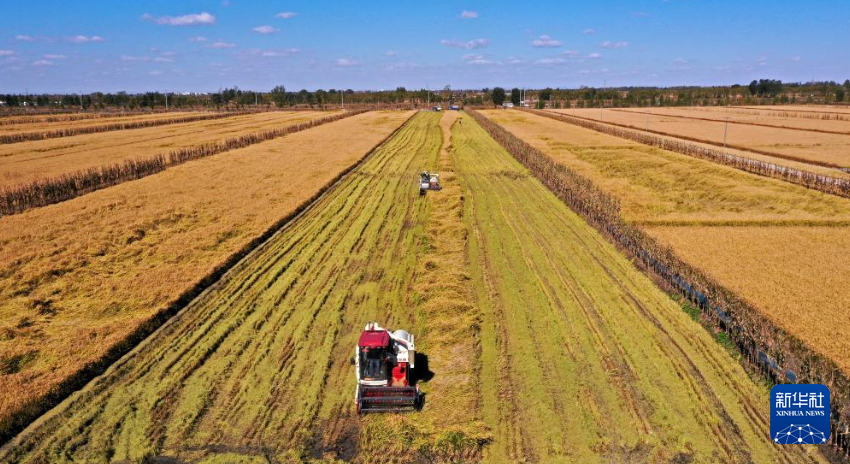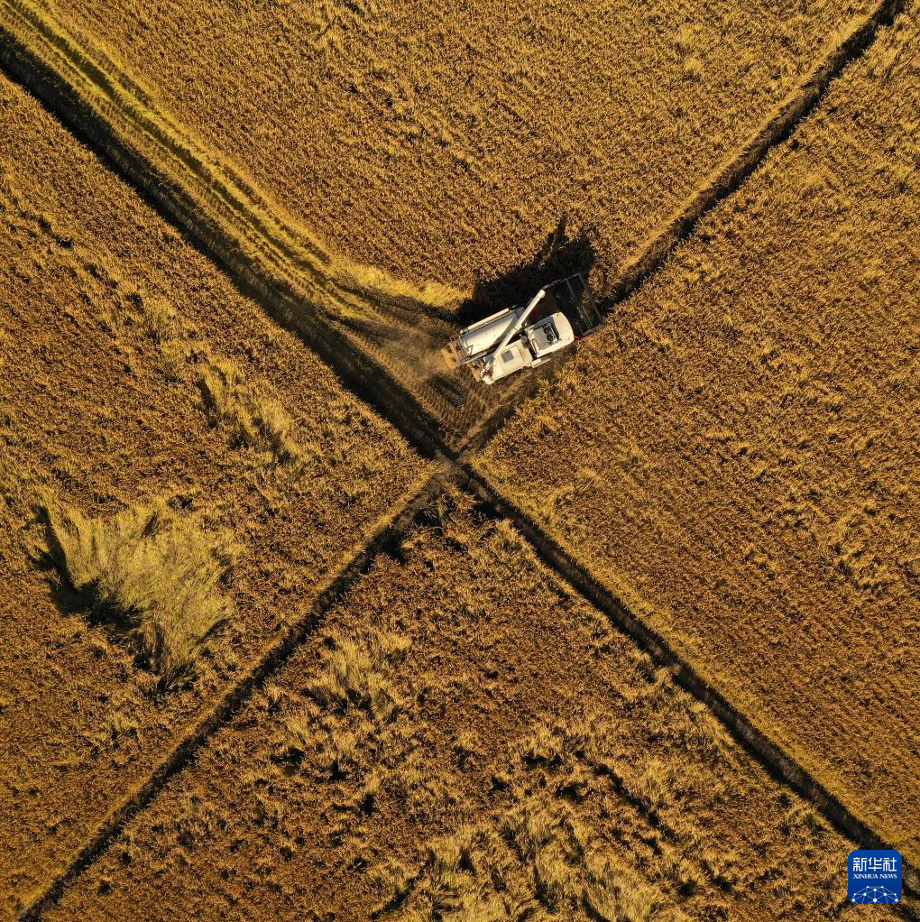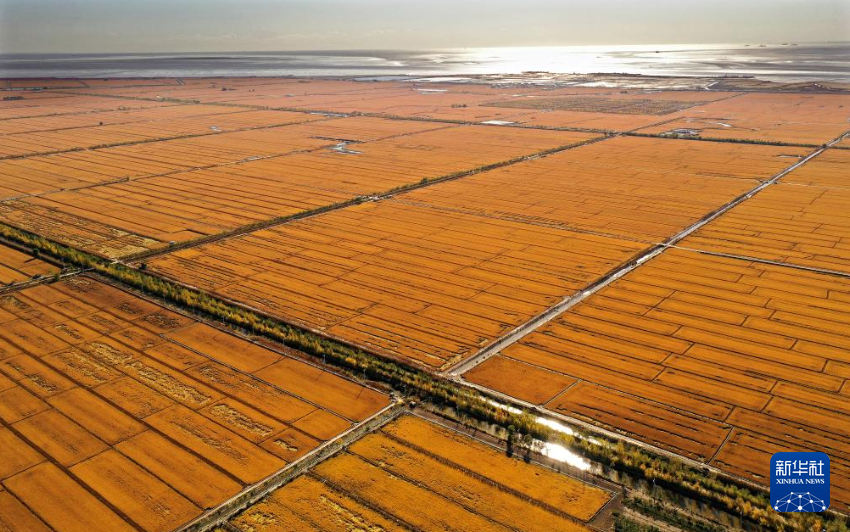 金秋时节,我国水稻主要产区之一——辽宁省盘锦市辽河三角洲水稻产区迎来集中收割季,一台台农机在田野上收割庄稼,空中俯瞰大片田地满目金黄。