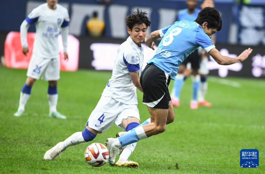 武汉三镇队球员韦世豪(左)与大连人队球员朱挺在比赛中拼抢。新华社记者 陈为 摄