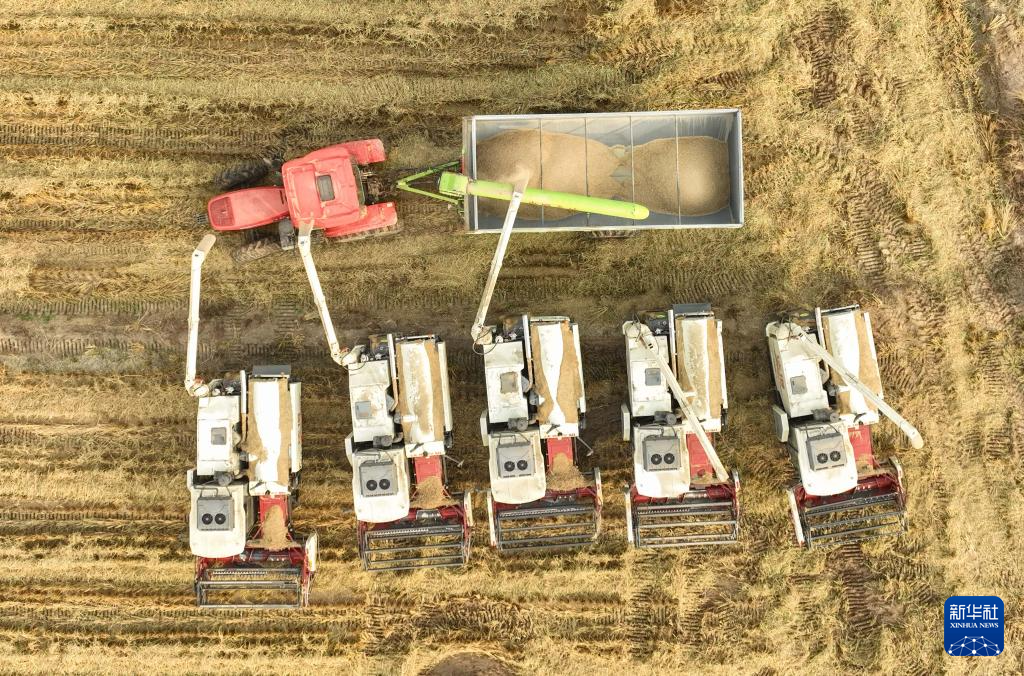 金秋时节,辽宁省阜新市彰武县大冷镇上三家子村的稻田里机声隆隆,一片丰收的繁忙景象。