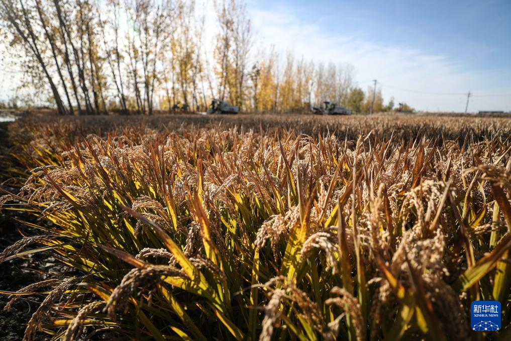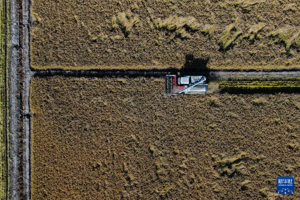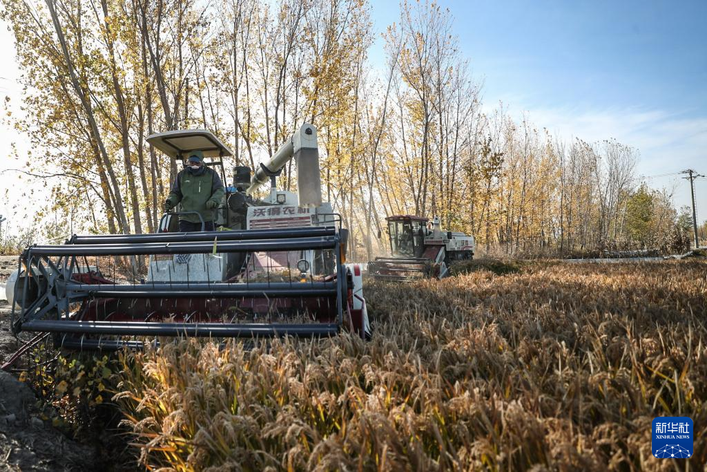 11月3日,农户驾驶农业机械在盘锦市大洼区王家街道兴海村收割水稻。新华社记者 潘昱龙 摄