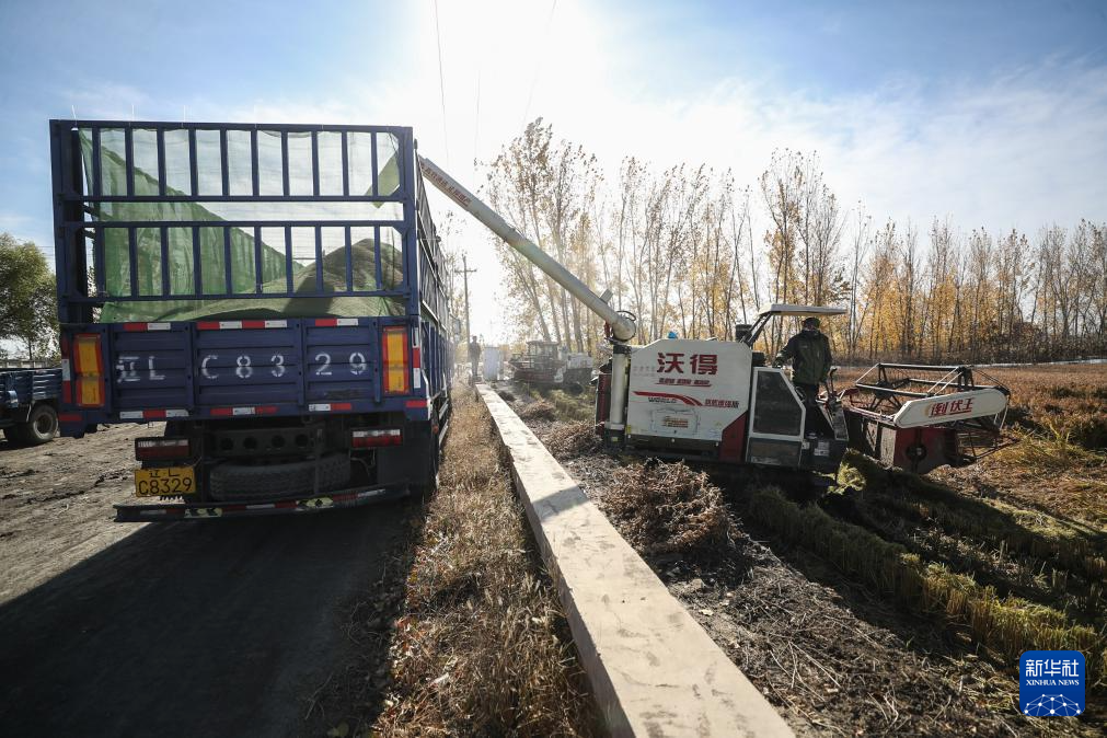 11月3日,农户在盘锦市大洼区王家街道兴海村将收割的水稻装车。新华社记者 潘昱龙 摄pagebreak