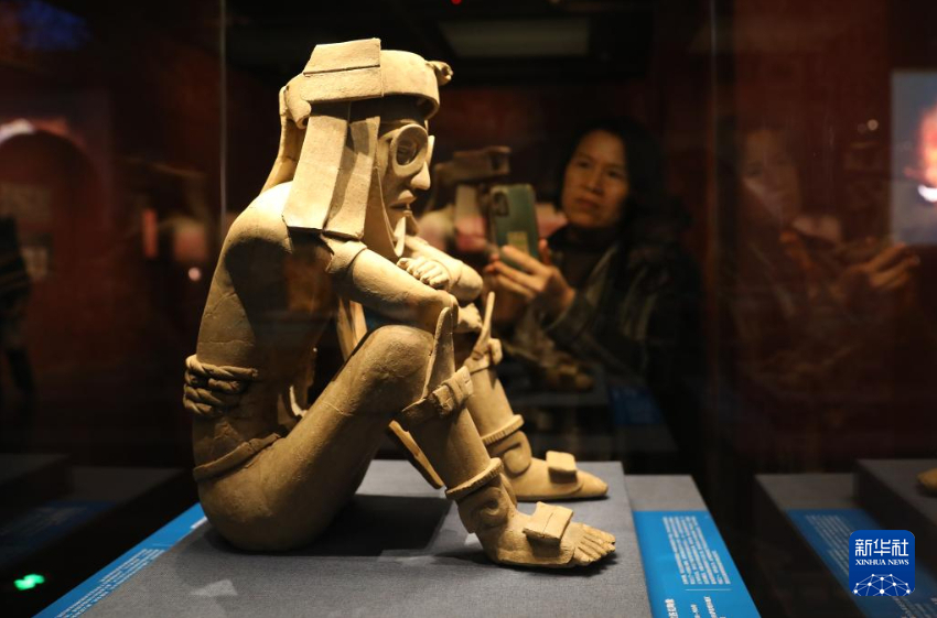 参观者在辽宁省博物馆观看墨西哥古代文明展展出的文物——豹人陶俑(11月3日摄)。新华社记者 姚剑锋 摄pagebreak