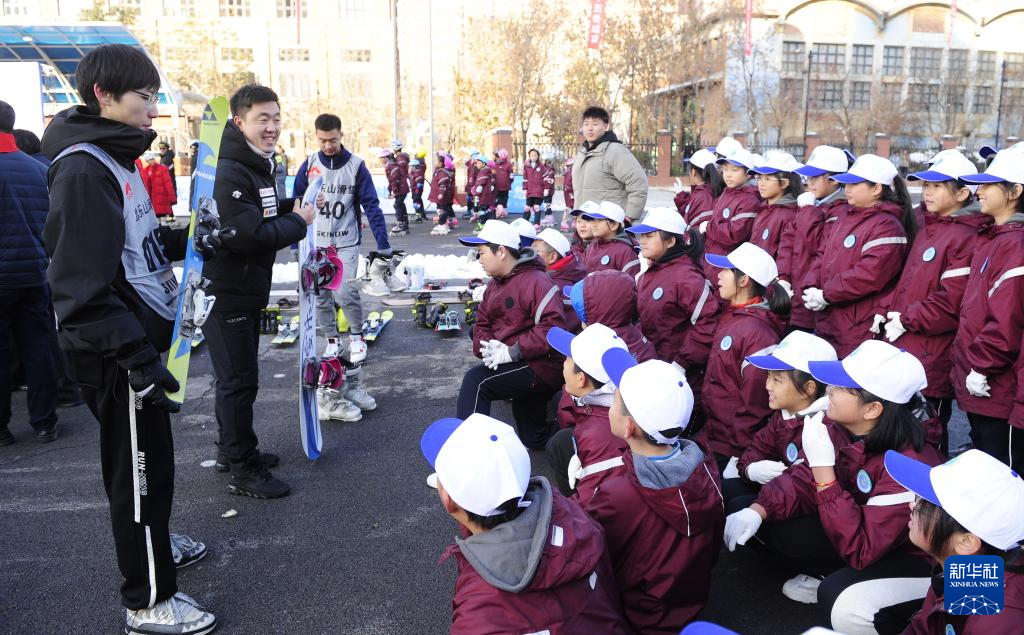 滑雪教学体验活动中,教练员为学生讲解滑雪基本知识。刘艺淳摄