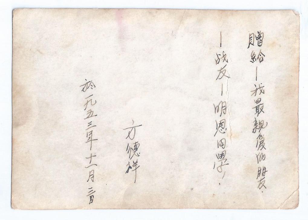 图为抗美援朝战士方德祥于1953年赠送给复转军人纪明恩的照片正面。纪明恩(去世),黑龙江阿城人,1946年参军,1948年8月参加辽沈战役总攻,沈阳解放后先任沈阳市工业局人事科科长,后于1958年组建沈阳汽车制造厂。(受访者供图)