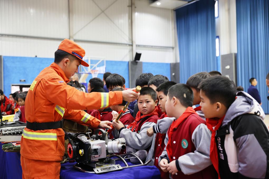 讲解员为师生介绍灭火救援装备(受访者供图)