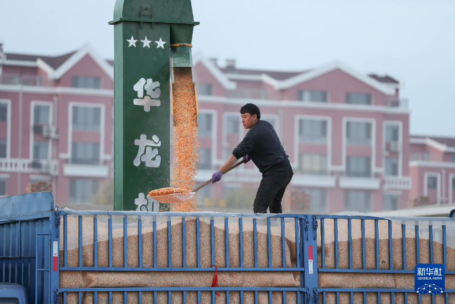 10月17日,官营子村村民将玉米粒装车。新华社记者龙雷摄pagebreak