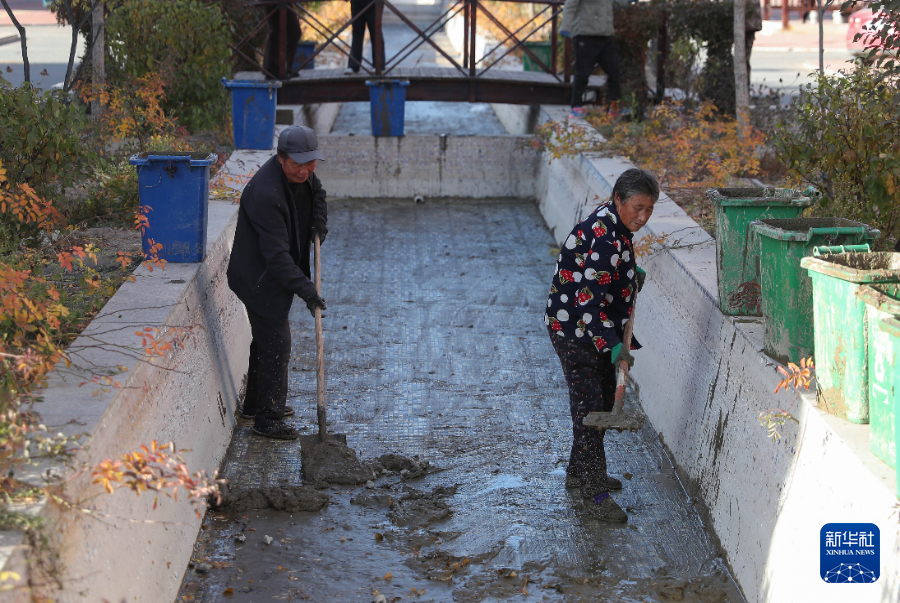 10月31日,官营子村村民在住宅区清理水塘。新华社记者龙雷摄pagebreak